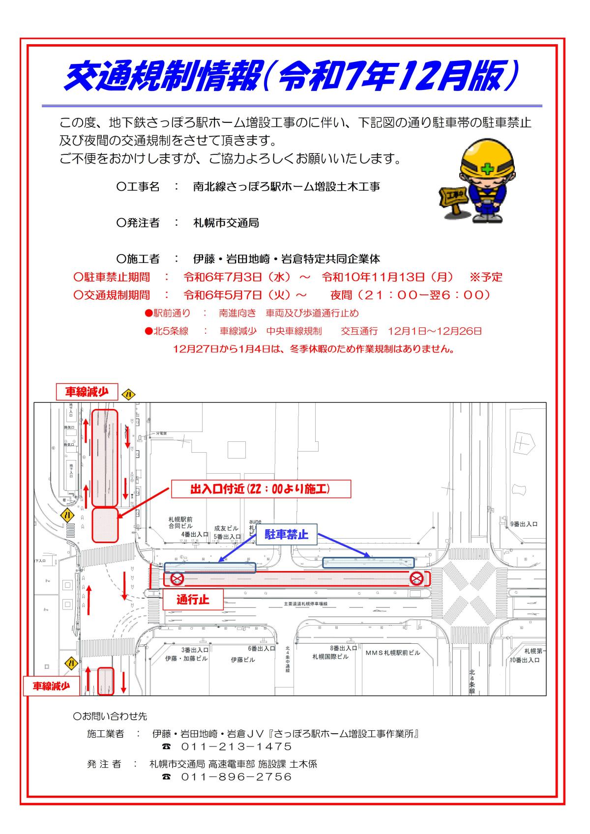 地下鉄南北線さっぽろ駅ホーム増設工事に伴い、北5条線及び駅前通りで下記のとおり、夜間の交通規制を行います。
